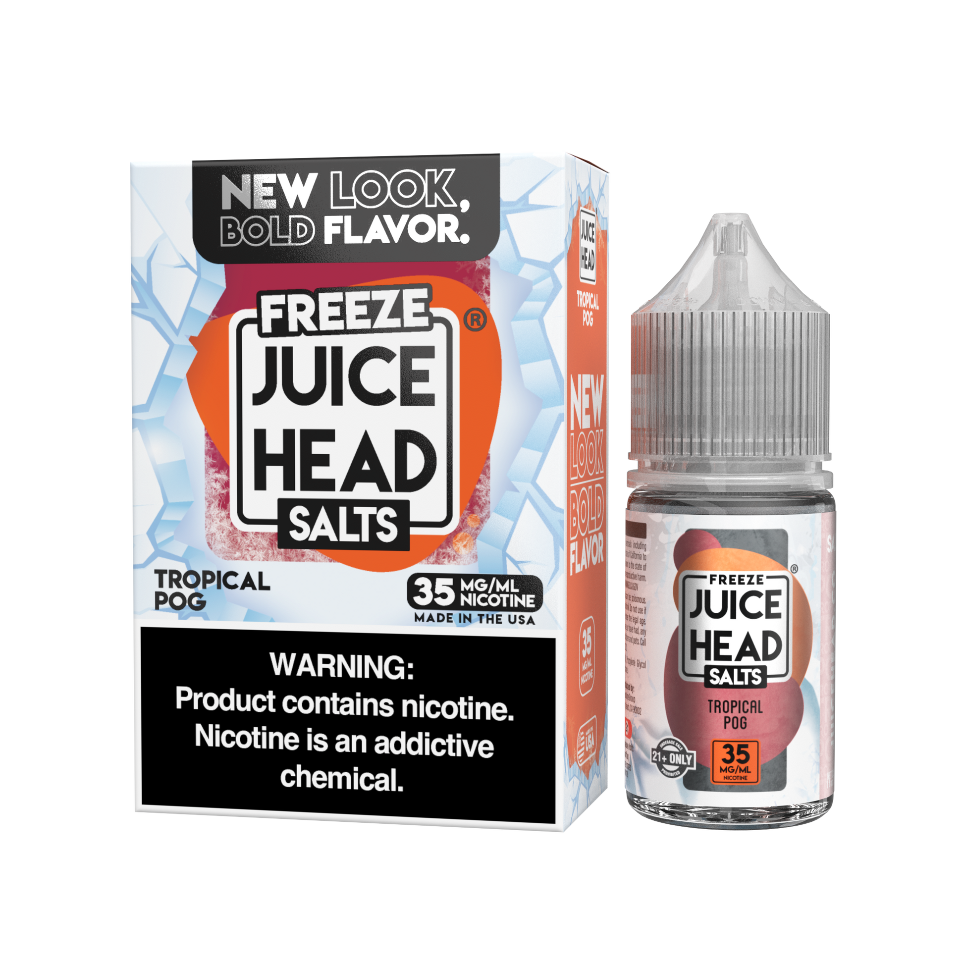 STORE LOCATORFreeze Juice Head Salts Tropical POG delivers a bold, island-inspired flavor profile that blends bright citrus, smooth tropical fruit, and a refreshing icy finish. Designed for adult users who enjoy layered fruit blends with a cooling edge, this e-liquid brings together passionfruit, orange, and guava in a balanced and flavorful experience that stands out from the first draw to the last.
