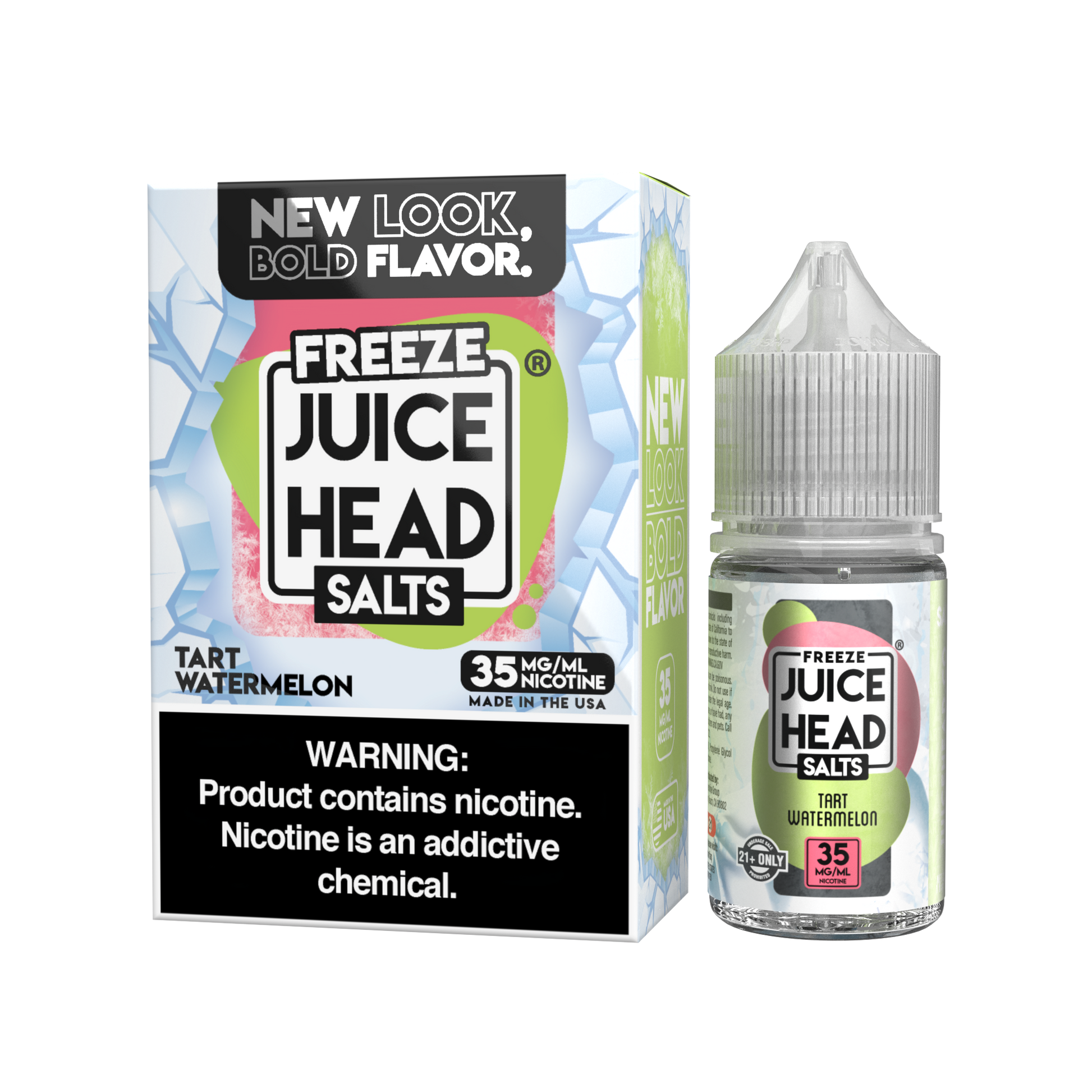 The bottle features a child-resistant cap and a precision tip for easy, clean refills. Freeze Juice Head Salts packaging uses bold visuals and clear flavor labeling, making it easy to identify while maintaining a cohesive look across the Freeze lineup.